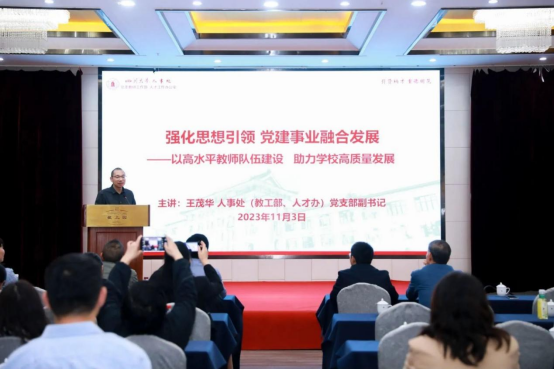 人事处(教工部、人才办)人才交流中心主任王茂华以“强化思想引领 党建事业融合发展——以高水平教师队伍建设,助力学校高质量发展”为题,结合党的二十大报告精神、学校党委九届二次全委会决定和下半年重点工作,就人事处(教工部、人才办)党支部在师德师风建设、人事制度改革等方面如何发挥党建引领作用进行了解读。