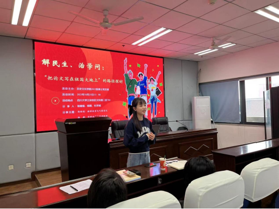 活动由2022级博士党支部副书记曾莹同志主持,支部内来自不同专业的杨璐瑜、杨朝、杜京城三位同志分别结合自身的专业特性和研究领域,分享了他们关于如何在学术研究中为国家社会发展添砖瓦、献力量的见解和经验。