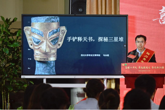 分享会首先观看了“中国青年五四奖章”宣传片《百年奋斗 永跟党走》。之后,三位“中国(四川)青年五四奖章”获奖者和集体代表依次上台分享了学习贯彻习近平总书记在庆祝中国共产主义青年团成立100周年大会上的重要讲话精神的收获。马永超从梳理川大考古团队探索古蜀文明历程开始,详细讲述了川大考古团队在发掘第5、6、7号祭祀坑过程中克服的重重困难和获得的”大丰收”,并表示川大三星堆遗址考古队将一如既往地坚守初心、永远跟党走,在继承老一辈学者优良传统的基础上,继续探索三星堆的故事和古蜀文明发展的脉络,为中华民族伟大复兴的“中国梦”持续贡献90后考古青年力量,用更优秀的成果献礼党的二十大。