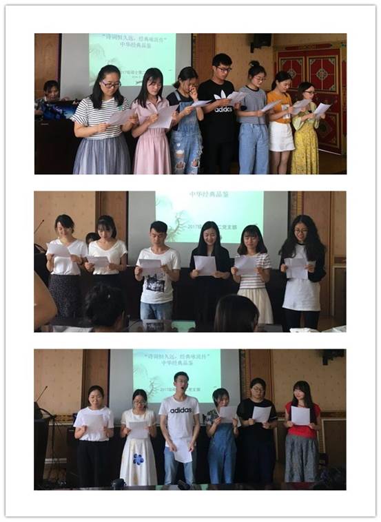 第一个环节是古典诗词小组集体朗诵,第一个上场的是刘雪健同志小组,他们为大家带来的是一首经典名诗——《春江花月夜》,七位成员昂扬饱满的热情和抑扬顿挫的朗诵,仿佛让大家感受到了“春江潮水连海平,海上明月共潮生”的波澜壮阔的场景。接下来是张悦小组朗诵了一首李白的千古名诗《将进酒》,当读到“天生我材必有用,千金散尽还复来”让我们被李白豁达自信的追求、积极乐观的人生态度所感染和激励,小组成员默契的配合和充满感情的朗诵赢得了大家热烈的掌声和喝彩声。最后是赵倩倩小组带来的精彩朗诵。当听到众人齐声诵读出“人生代代无穷已,江月年年只相似”这一名句时,让人不禁感叹光阴似箭,人生短暂。