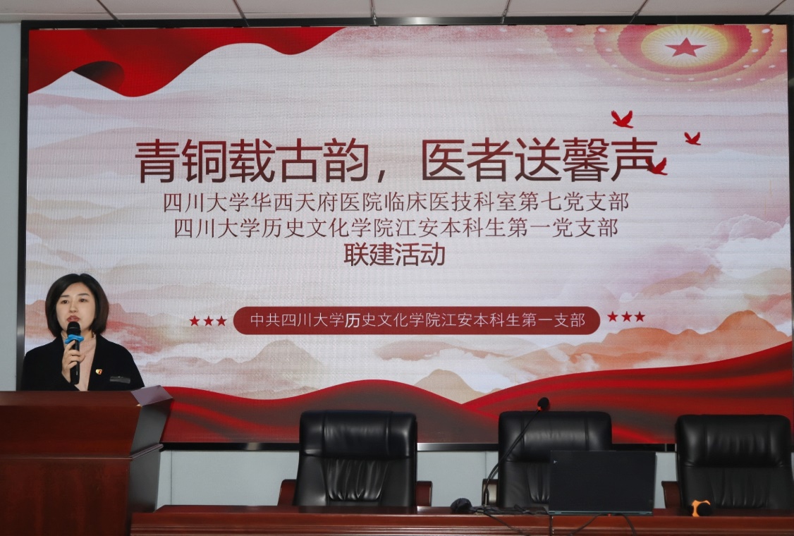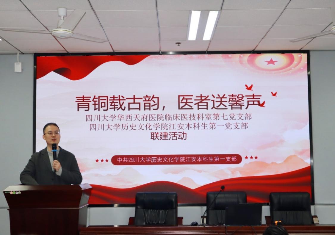 江安本科生第一党支部书记马轩老师进行致辞。马轩老师代表学院对华西各位老师的到来表示欢迎,随后概述学院百年历程与现有学科,强调历史学与医学在灾荒史、疾病史、公共卫生等课题上的关联,并举例说明社会史视角下的医疗研究价值。他指出,今天的联建活动既是支部交流学习,也是医学温度与历史深度的握手,希望大家通过活动了解用药常识、体会科技考古魅力,更期待双方建立长期合作机制,共同传承医学知识与中华优秀传统文化,实现知识、健康、友谊的多重收获。