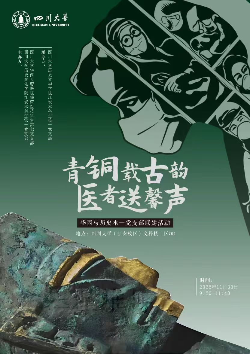 江安本科生第一党支部联合主办的“青铜载古韵,医者送馨声”联建共学活动在江安校区文科楼二区704报告厅顺利开展。华西专家、历史学院师生共计60余人齐聚一堂,以“党建+学术+健康”的跨界融合模式,共赴一场跨越三千年文明与当代医学温度的对话。