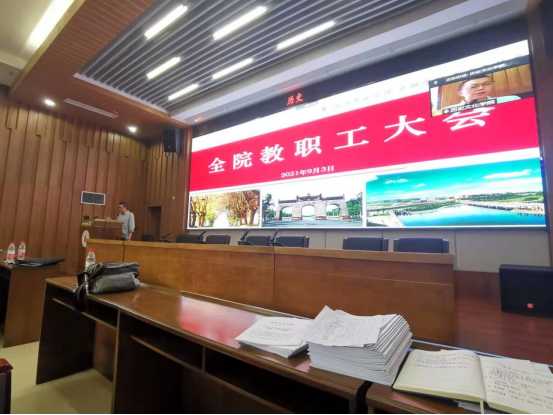 全体党政领导、全体行政人员、部分教职工在主会场参加会议,博物馆、古籍所教职工在分会场参加会议。