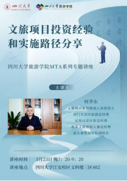 讲座伊始,何季东老师结合自身 22 年的旅游行业经验,从疫情背景下的旅游产业现状切入,指出旅行社、旅游景区、民宿、旅游酒店、航空公司等旅游企业大多受损,但近郊旅游、规划公司等领域却持续火爆,如成都 “五一” 假期接待游客 1361 万人次,天府艺术公园等主题展览吸引大量游客,邛崃市开展的街头活动激发文旅市场复苏新动能。他强调,旅游企业应正确认知当下旅游产业投资发展的背景,把握投资机遇。
