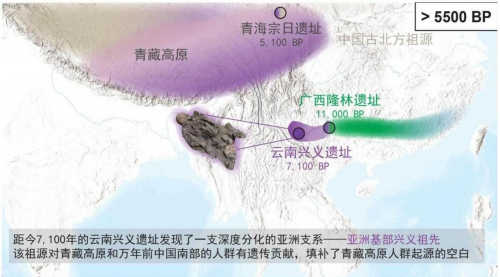 本研究的第一项突破是首次发现青藏高原“幽灵祖先”。青藏高原人群遗传结构一直备受学界关注。根据此前研究成果,距今5100年前至今,青藏高原人群遗传成分中约80%源自9500-4000年前的中国北方人群,其余20%来源不明,学界称之为“幽灵祖先”。这一成分来源一直未能确定,备受学界关注。本研究通过基因捕获、测序,从云南兴义遗址一名距今7100年前的个体(Xingyi_EN)基因组中识别出一种新的、深度分化的亚洲遗传成分,研究团队判定其为“亚洲基部兴义祖先”(Basal Asian Xingyi Ancestry)。研究表明,这一遗传成分不仅对古代青藏高原人群有遗传贡献,也广泛存在于现代藏族人群基因组中,以Xingyi_EN为代表的古老人群正是学界关注但之前尚未精准定位的青藏高原“幽灵祖先”组成成分之一,为东亚人群迁徙、演化过程提供了新证据。