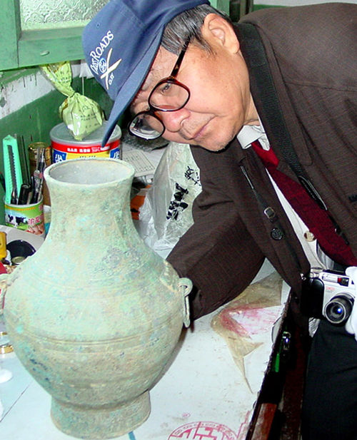 著名考古学家林向在观看重庆小田溪战国墓群出土的铜壶 杨磊 摄