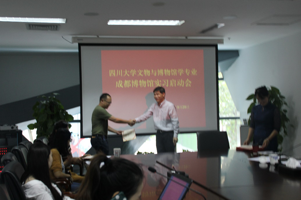 鲍成志副院长讲话:他首先肯定了往届文博专业学生在成都博物馆的实习成果,并建议同学们虚心地向馆内老师学习,将理论知识与实际工作结合,最后对成都博物馆表示感谢。讲话结束后,鲍成志副院长代表学院向成都博物馆的实习指导老师颁发聘书。