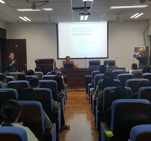 王献华教授主持,西南交通大学的唐钧老师也出席了讲座。开场王献华教授对拱玉书教授以及《吉尔伽美什史诗》进行了简短的介绍。正式开始之后,拱玉书教授首先对整个亚述学的研究领域与上古时代两河流域的文学发展做了概括性的说明,然后对《吉尔伽美什史诗》的起源、发展到最后新亚述帝国时期成型进行了介绍。在让同学们对背景知识有了一定的了解之后,拱玉书教授开始具体讲述《吉尔伽美什史诗》的具体内容。吉尔伽美什是生活在公元前2900年前后的一位国王,他的传奇故事成为许多文学作品的关注对象。大约在公元前1800年的古巴比伦时期,形成了将各种传奇故事串联在一起的《吉尔伽美什史诗》。大约又经历了五个世纪,一个叫Sin-leqe-uninni的文学巨匠把《吉尔伽美什史诗》拓展为十二块泥版的鸿篇巨著,流传至今。收录其中的主要有六个故事:《吉尔伽美什、恩启都与阴间》、《吉尔伽美什与胡瓦瓦》、《吉尔伽美什与天牛》、《吉尔伽美什之死》、《洪水》与《伊楠娜入冥府》,整个史诗由阿卡德楔形文写成。