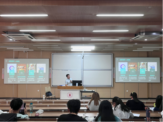 随后,杜丘先生向同学们介绍了酒店行业成本控制的特点和原则:酒店行业陈本控制涉及部门多、成本控制点复杂、受市场影响大;酒店成本控制需要遵循全面性原则、效益型原则、责权利相结合的原则。筹建期成本控制涉及的成本项目包括物资采购成本,经营期的人工成本、运营成本,以及财务费用、税费支出等其他相关成本;涉及的部门包括客房部、餐饮部、工程部等。