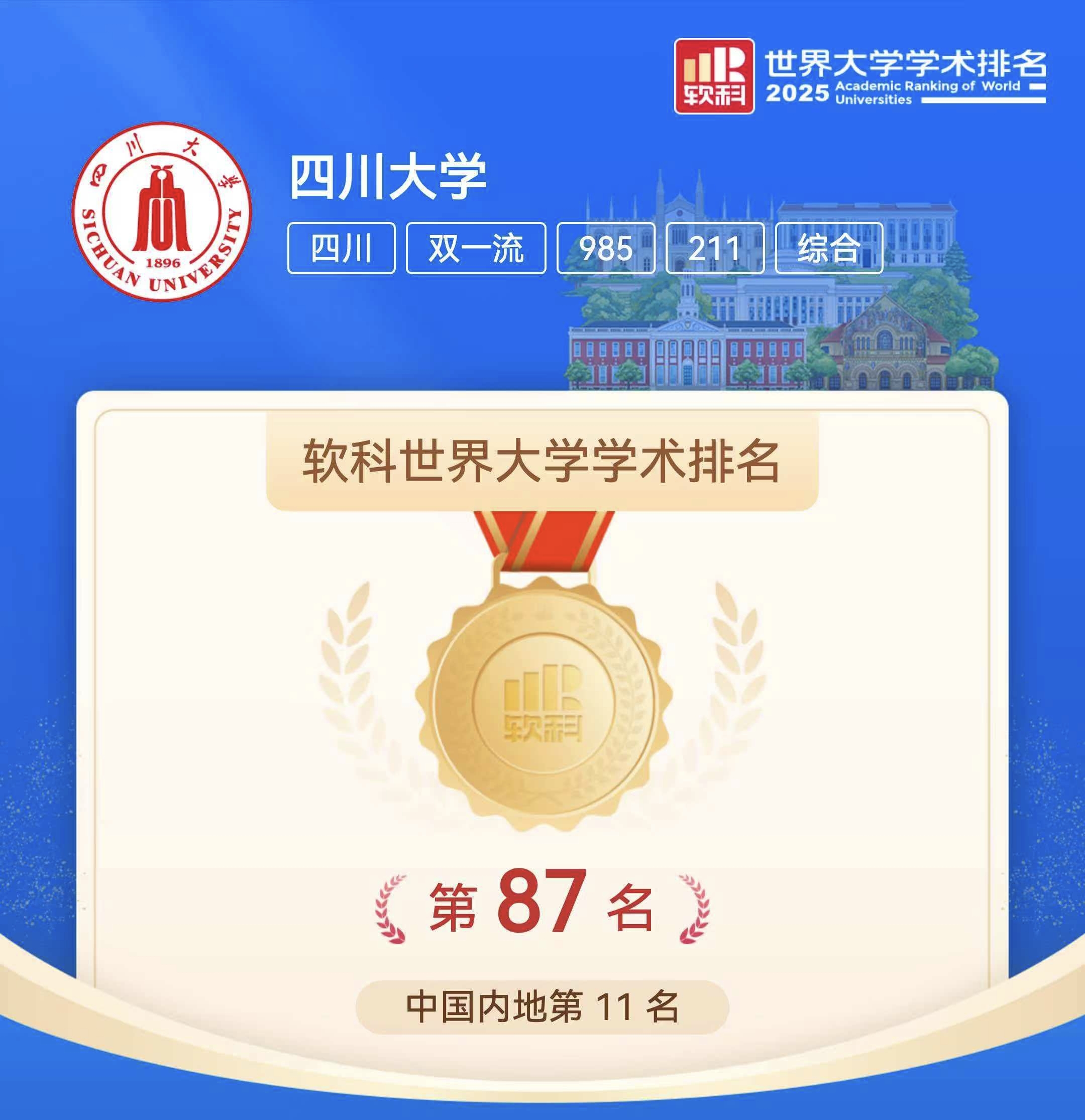 4.化学学科进入ESI全球前1‱学科领域,材料科学等8个学科进入全球前1‰,环境与生态学等21个学科进入全球前1%。口腔医学、护理学连续五年保持中国最好学科排名第一,考古学、药学与药理学新晋QS“全球前100”。学校软科世界大学学术排名跃居全球第87位。